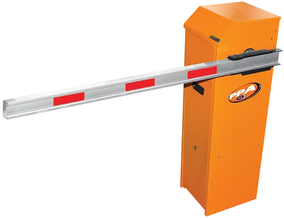 A barreira das Cancelas Automáticas de Alto Fluxo pode ter até 6m. É feita em tubos de alumínio na cor branca com fita adesiva na cor “vermelho segurança”, placa de alumínio anodizada com inscrição PARE em ambos os lados, no centro